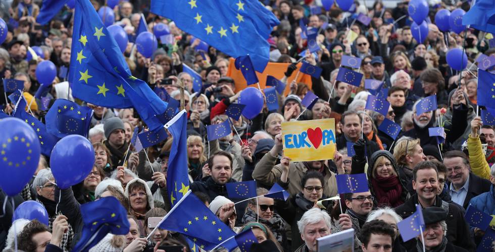 La bandera de las 12 estrellas encuentra por fin defensores Más de 25.000 personas se manifiestan en 50 ciudades para mostrar su apoyo al proyecto europeo